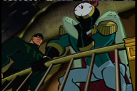 Clock King returned to crime months later with Gorilla Grodd and Black Manta in a scheme to steal a United Nations communications satellite about to be launched at a military airstrip. They were challenged by Aquaman, Green Arrow, and Black Canary only to be hypnotized by the pitch of Music Meister. After Meister launched the satellite and fled the scene, the trio of villains were taken to Iron Heights. Grodd and Clock King soon escaped only to be defeated by Red Tornado and Green Arrow. Some time later, Clock King resurfaced in Star City. He and his Minute Men bypassed a simple time lock and stole from the Star City Bank. However, he was challenged by Green Arrow and Aquaman. He was defeated when Aquaman summoned several lobsters to pinch him mercilessly and Green Arrow knocked him out with a boxing glove arrow.