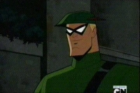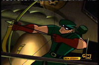 After being teleported to Mongul's Death Race, Green Arrow encountered a very different Batman. However, when Batman referenced a former mission incorrectly, Arrow realized his plan was to distract Mongul while the other heroes sabotaged his Warmoon. When aboard the moon, Green Arrow revealed a device hidden in his shoes that could generate an electromagnetic pulse. While Woozy Winks activated it to weaken their prison cell force field, Arrow used Plastic Man as a bow and shot Green Lantern, Guy Gardner, into the hole to get his power ring back. A short time later, Green Arrow faced off against the Clock King when he robbed the Star City Bank. He was surprised to see Aquaman on scene to assist in saving the day.