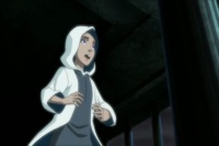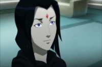Raven escaped her father's realm and yearned for a home. Starfire took her in at the Titans Tower. The night of the Hall of Justice's unveiling, Raven, now 14 years old, had a nightmare. The next day, during training, Beast Boy asked about it but Raven dismissed it as just dreams. Upon meeting Robin, Raven sensed sadness. The next day, Raven healed Robin after Blue Beetle's Scarab blasted him in the heat of battle. She said the words "Azarath, Metrion, Zinthos" and saw flashes of Robin's past. The Titans escorted Raven to her room to recover. Raven was unable to shake off what she felt from Robin. That night, Raven went outside and cast a protection spell on the team, without their knowledge, from being corrupted by Trigon. Robin appeared and thanked her for healing him. He didn't appreciate the part where she was in his head. She made it clear she wanted to left alone but he asked about the one that looked like a man. Raven dismissed it was a nightmare. Robin wasn't so sure. Raven became irate and told him it was none of his business then went through a portal.