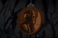 The Batman once intervened a heist of money printed plates committed by the Ventriloquist and Scarface. To catch the criminals, the Batman utilized a Giant Penny kept in the building. After the case, the Batman kept the coin in the Batcave's trophy room. It was later used by D.A.V.E. to form a death trap. If the Batman chose to save his secret identity, Alfred Pennyworth would get killed by the Giant Penny. The Batman managed to instead destroy D.A.V.E. with it. It survived up to the year 3027 along with most of the other mementos.