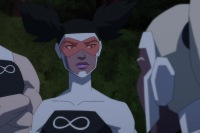 On November 10th, Team Year Ten, Trajectory took part in the Infinitors mission to rescue the kidnapped Queen Perdita Vladek. They made their way to a group of 16 cabins in the woods of Markovia where Fury's sources tipped her off that the power-armored squad who broke Count Vertigo out of prison and kidnapped Vladek were seen. The power-armored squad attacked the Infinitors. Geo-Force ordered Trajectory to check every cabin and find Vladek. She soon returned to Geo-Force with her. He departed to take her back to the royal palace. Trajectory promised he could count on them to finish the battle. She told Fury she was going to help Everyman and ran into the woods following the sound of his roar. She reported to Zviad Baazovi about Geo-Force. He ordered 13 of the squad to stop playing a recording of Everyman's roar. Later that night, back at the palace, King Brion was fuming none of the kidnappers were caught. Trajectory apologized. He discovered Queen Perdita was not in her room and ordered the palace and grounds to be searched. Everyman and Trajectory shared conspiratorial glances with each other.