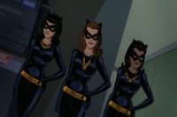 Catwoman agreed to the terms but wanted to fix her hair so she would look good in front of the judge. Batman allowed her. Catwoman reached into her purse and sprayed the heroes with knockout gas. They awoke atop a giant TV dinner on a conveyor belt to a giant oven. Catwoman tried her Batnip on Batman and scratched his cheek. She ordered Batman to kiss her but he refused. Not one to cry over spilled milk, Catwoman deferred to the Joker who turned the conveyor belt on. Catwoman unknowingly hitched a ride on the Belgravian space shuttle with clones of the Joker, Penguin, and Riddler to an abandoned space station constructed by the U.S. and Belgravian governments under the false pretense of a plan to use the Replica Ray to duplicate Earth and give each villain a Gotham City to rule. Citing her soft stance on Batman, the other villains turned on Catwoman and they attempted to vent her out of Airlock 1. Luckily, she was grabbed by Batman at the last second.