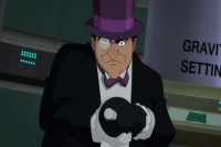 During the battle, Penguin hooked Robin's leg and tossed him off the blimp. Catwoman rescued him with her whip. As the battle turned in the heroes' favor, Penguin leapt off the blimp with his umbrella open. Catwoman whipped it out of his hands. He landed in a fresh fish stand outside a market. Penguin was one of the super criminals "volunteered" to be a test subject for Hugo Strange's Evil Extractor at the state penitentiary. They were affixed to chairs with arm and leg restraints and domes were lowered over their heads. Penguin found the whole thing unconstitutional. Strange explained the Evil Extractor would siphon the reservoirs of evil deep in the criminals' warped brains then, deposit it into the Collection Vat. Strange told Dr. Quinzel to instigate the extractor protocol. Evil Essence flowed into the vat. Joker had a plan and told the others to concentrate in order to overload the Extractor with their collective evil. Strange realized what they were doing and ordered Quinzel to turn it off. It was too late, and District Attorney Harvey Dent was exposed to the Evil Essence and turned into a new super criminal named Two-Face.