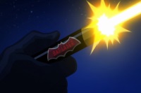 The Bat-Laser is a roughly pen-shaped object that fires a laser beam. While Two-Face was preoccupied with shooting at Robin from his bi-plane, Batman took out the Bat-Laser and severed the tanks of Evil Essence from the bi-plane which effectively crippled the villain's master plan.