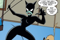 Catwoman is a master thief and a former flame of Batman. To help Poison Ivy finance a strike against Wayne Enterprises' development project on the Newton River, Harley Quinn devised a better plan than robbing a bank. She was under the impression that Catwoman was out of town. As a criminal, she wouldn't go to the police if she was robbed. Harley took her Whoopee Glider up to Catwoman's penthouse. She took down a lion portrait and opened her wall safe with a combination consisting of Catwoman's birthday, mistakenly entrusted to her. Harley prepared to raid her jewelry collection but Catwoman caught her red handed. Harley claimed it was for a good cause. Catwoman snagged Harley's left leg with a whip and slammed her on her back. Harley zapped her with a joy buzzer. They got into a scrap until Batman and Nightwing arrived. No one was talking. Batman pointed out an escaped felon was in Catwoman's penthouse and she was on parole. He could call the police. Catwoman called his bluff.