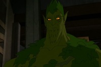 To keep him subservient, Ivy had to kiss him every six hours. Trying to reverse engineer their own DNA for the virus would takes years, even decades. It was determined they could expedite the process with Dr. Alec Holland's Bio-Restorative Formula. Two days later, Floronic Man and Poison Ivy broke into the Gotham City branch of S.T.A.R. Labs but the former tripped the alarm. Floronic Man engaged the security guards while Poison Ivy quickly tried to locate files on Dr. Alec Holland's Bio-Restorative Formula. The guards' bullets did little against Floronic Man's regenerative abilities. He shoved and threw them around like rag dolls, and killed at least one. One guard was nearly thrown at Ivy. She knocked him out with a stapler and continued searching. The formula was discovered. She downloaded the classified level 12 file to her thumb drive. Batman went over Goldblum's apartment and found Floronic Man's leaf, immediately recognizing it as a completely different phylum from anything in their dimension.
