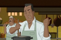 One night, the Harley Quinn waitress at Superbabes brought the orders to four men in a booth. One of the men reached under her skirt despite Harley's warning. She threw him to the floor and broke his arm. She turned the rest of the men and asked if there was anything else she could do for them. They all declined. The man complained to Chick, the proprietor. He continued stirring a pot and gestured to the Wonder Woman-themed warning sign "Look all you want but don't touch the girls."
