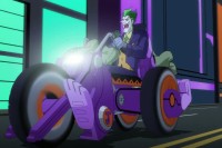 Later that night, Joker left the Gotham Boardwalk on the cycle then returned just as Batman and his allies finished rounding up Joker's. He returned with the Batmobile, Batplane, Ace, and Cyborg under his control due to the effects of the Digital Laughing Virus. Some time later, on the cycle, Joker robbed a Gotham National Bank but Batman gave chase in the Batmobile. Joker entered a narrow alley but Batman simply summoned Ace, who shifted into its cycle form, and followed. Ace shot out tendrils from its mouth and grabbed the rear of the Gorilla Cycle. Joker was ejected and went flying into a pile of trash bags.