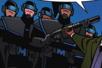 By the time M-Force was unveiled to the press, Summer Gleeson already heard a rumor that Gordon disapproved of it. Mayfield lied he was one of its greatest champions. Gordon secretly met with Batman and shared the results of his background check on the squad members. M-Force soon hit one criminal enclave after another. It became clear they had no real tactical planning and just attacked with an all-out assault with take-no-prisoners bloodlust. Their brutality and massacres were easily covered up. Commissioner Gordon watched as the morgue was lined with bodies. Mayfield had the press office working overtime, making the M-Force sound like Gotham's godsend. Several days after the Z Street Gang hit Gotham National, they were the next target of M-Force. Batman intervened and saved the life of one gangster, taking a squad member with a haymaker. He was surrounded outside the hideout but Batman's smoke pellets went off and he took the gangster from the scene with his grappling gun.