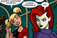 Ivy's "home security system," several vines, grabbed the Talons then she fired her cactus's toxic needles at them. The Talons were unaffected and broke free. One punched Ivy. Batman and Robin arrived and the Talons suddenly retreated. After tending to Catwoman, Batman asked Ivy to find out if the Gaia Grain was safe. Ivy was not amiable at first and cited Batman being somewhere below a weed whacker in her book. Harley urged her to help and brought up how they defeated Joker and Straightman together earlier that year and before that, her old girlfriend. Before Ivy could reply, Harley speculated Batman wanted to become a farmer. Selina Kyle regained consciousness and called out from the room. Batman asked her if she was all right then she kissed him. Batman carried her out. She thanked Harley and Ivy for having her back. Ivy informed Batman the Gaia Grain has a remarkable rate of growth, overtaking her greenhouse in one day from just a small dose of her own special plant food.
