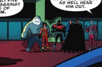 King Shark reckoned a midnight snack arrived. Batman jumped over him and threw a net on him then threw out a Batarang to counter a boomerang thrown at him. He quickly pinned Captain Boomerang to a wall with three Batarangs. Deadshot raised his gauntlet to the back of Batman and teased it would be a shame to blow his head off after he saved his sorry butt. Batman already deduced as much. Katana found Batman as charming as ever. Boomerang teased he was still the bat you loved to hate. Muscle clarified he only hated Batman. Batman mused his recommendation for Muscle paid off. Muscle promised he would quickly serve his time then look him up. Katana asked Batman if he was walking out peacefully or if it was going to be messy. King Shark liked messy. Amanda Waller told the team not to bother since there were only five of them against one of him and he would not leave until he was ready so she wanted to hear him out.