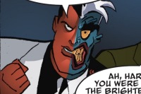 Mayfield commended him on being the brightest light during his first administration. Batman and Robin burst in through the skylight. Two-Face went after Robin. Robin taunted him with his Puke-Face nickname and goaded Riddler. He leaped over Two-Face, who was inadvertently bashed by Riddler's cane. In search of Cassie Kendall, Batman and Harley Quinn both incidentally tracked Two-Face to the Second Chance Mission. Harley disguised herself as a homeless old woman seeking shelter but a henchman was brusque with her. She immolated him a a Molotov cocktail then entered the mission. Two-Face fired off warning shots and told her the answer was "no" to whatever she wanted. Batman disarmed him with a Batarang and put out the henchman with a miniature extinguisher. Harley asked Two-Face about Rusty Franks to his surprise. She knew him from Joker's gang back in the day and recognized one of Cassie Kendall's kidnappers using the same "Ditzoid" nickname Franks used to say when he thought she wasn't listening. Two-Face claimed he hadn't seen Franks since his last stint at Arkham Asylum and he would never hurt "Sweet Cassie." Harley and Batman realized he and Kendall had a fling, too. Two-Face admitted it was a one or two night fling. Harley kicked him flat on his back. Batman tied him up. Two-Face was later one of the criminals kidnapped by Ra's al Ghul's Talons and imprisoned for months until he was released by Catwoman. Rupert Thorne wanted a shot at Ra's but Two-Face pointed out it was Batman's mess to deal with. Black Mask left it to Two-Face to lead them out. They were arrested by police.