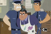 Bane is supposedly Gotham City's deadliest supervillain. He is known to use his famous strength-enhancing Venom to get super strong. He escaped prison and infiltrated Metropolis High School as Diego Dorrance, a substitute art teacher, in an effort to collect chemicals in the sciene lab so he could make more Venom. Mr. Dorrance bumped into Barbara Gordon and Jessica Cruz in the hallway and told Gordon he expected great things for her "Food is Art" assignment. She perked up and stated anytime a burrito could be homework was a win-win. They did fist bump then he gave Cruz a fist bump. Gordon wished her father was as cool as Dorrance. Near the end of the week, Commissioner Gordon and two police officers moved in and arrested Dorrance. Babs Gordon burst in to tell her father she wanted a little space but was shocked to see Dorrance in hand cuffs. The younger police officer stopped to explain everything to her.