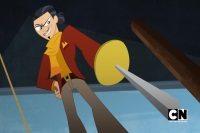 Arrow asked for a sword. Jordan, from a trapdoor, remarked how it was the weirdest play ever then tossed out a sword. Cavalier told Arrow to stay out of his way. Arrow countered he would always protect his friends, even the ones he hated like Zee Zatara. They dueled. Arrow cut a rope and rode it up to the look out post where he fired his arrows. Cavalier dodged the bola trick arrow and then insulted his elocution and fired a cannon. Arrow was insulted and fired his cannon ball trick arrows at him. Zatara ordered Beecher to lower the curtain because her play was ruined. However, the crowd loved what was going on. Zatara shook Beecher and told her to raise the curtain because it was a triumph. Arrow teased he deserved the bad reviews. Cavalier countered he had as much stage presence as Zatara. She took offense. Arrow and Cavalier traversed the Minnow but Arrow lost his sword and was pinned. Arrow growled, kicked the sword away, rolled, and fired a magnet arrow. Cavalier's sword and him, by extension, were pulled to the magnet.