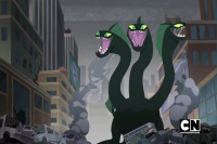 The Hydra is a creature with many heads often associated with destruction and curses. At some point, a Hydra was sealed in a pot. It eventually entered into Julia Kapatelis' collection in her Metropolis apartment. Steve the Griffin accidentally broke the pot on its first night. Diana Prince grabbed the griffin and reassembled the pot by hand very quickly. She neglected to put back the last piece and left. The Hydra seeped out of the pot in a non-corporeal state then out the apartment through a crack in the wall. A few days later, the Hydra fully manifested in corporeal form and wrecked havoc in the city. The heads tugged at a bus until the middle head chomped it. Steve realized what was happening and his demeanor changed. Wonder Woman got on his back and drew her sword. He took off and dodged the Hydra then Wonder Woman sliced their heads off. She congratulated Steve but the Hydra reformed with six heads total. Steve grabbed her and flew off. He dodged their strikes but dropped her. He recovered her just in time.