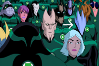 This Green Lantern has blue skin, appears to be faceless, and has four prominent spikes on his head. He fought in the battle against Sinestro and survived.