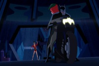 The Batcycle is a modified sports motorcyle owned by Batman. While under the influence of Poison Ivy's mind control spores, Batman attempted to drive Ivy to Metropolis on the Batcycle across a bridge made of seaweed. Plastic Man ran after them. He made holes in his body to avoid contact with the Batcycle's missiles, dodged its Batarangs, and sprung away from a volley of fireballs. Batman took to the Batcyle after Mr. Freeze took off in his snow ski following a jewelry store heist. Batman activated the snow treads with the press of a blue button and took off. However, Freeze blasted Plastic Man and his sled crashed into the Batcycle. Batman improvised and used Plastic Man as replacement tires. He caught up to Freeze and yanked him off the ski with a grapnel line. With Freeze neutralized, Batman continued with patrol rather then head to a tire store.