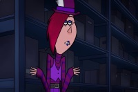 After the upper bathroom came crashing down to the first floor of the brownstone, E*Vil crashed at Wayne Manor. The demon Skaratata was accidentally released from its imprisoning sphere by King Tut when he lied he could kick Batman's butt. He levitated patches of ground into the air. Sad Hatter fell from hers but Man-Bat saved her. Batman recaptured Skaratata with a back up sphere. E*Vil gathered to watch the season finale of "Battle Ship Bake Off!" but the Joker spoiled the results, revealing Samantha won, and blasted an AntiGlow ray at them then they were all overcome with rage and trashed the brownstone. Sad Hatter brainwashed a police officer and store owner into dancing amid a fire. Later in the day, Sad Hatter robbed a vintage record store. Claire blocked her escape with a wall of flames. She turned around and was exposed to the Bat-Lightwave Blocker. She was turned back to normal but was naturally confused.