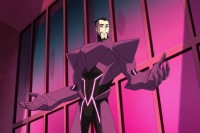 Ivo rose upstairs to the stage and told his guests Metropolis was once the safest city in America but was now in the midst of a crime wave unlike anything ever seen before. He turned to Superman and shaded him as someone to be wary of because he offered his help for free and the only person you could trust was yourself. Ivo then presented the Parasite as a way to become your own Superman. He looked around the crowd for a volunteer and chose Curtis. He sped towards him at super speed, grabbed him and shoved him through the glass window. Ivo dangled Curtis then threw him to lure Superman into the tower. Alex activated a force shield in the room to bar anyone else from fleeing the demonstration. Superman countered Ivo's attack with a gut punch but the Parasite absorbed the kinetic energy and the suit got larger and stronger. Superman tried heat vision but the Parasite absorbed it and Ivo fired it back at Superman. Ivo declared he built AmazoTech and deserved more. He threw a civilian at the field but Superman saved him then pulled Ivo back by the Parasite's tail and threw him on his back.