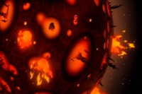 In 5,000,000 B.C., the Old Gods destroyed themselves and unleashed the Godwave upon the universe, seeding beings with power. The planet was split in half and formed two new planets. One was New Genesis and the other was Apokolips, formed by the power of an evil sorceress into a world of darkness and despair. Apokolips lacks any natural life and is one giant city that covers the planet. Its most notable feature are the Fire Pits that can be seen from space. Their exact origin is unknown whether it is mystical or scientific in nature. Darkseid rules Apokolips and is considered a god by the Lowlies, human slaves that toil endlessly in the Armaghetto districts. The planet is patrolled by Parademons, Suicide Jockeys, and Dog Troopers.