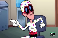 After the Titans failed to order the right sandwich for Amanda Waller, she detonated Beast Boy's butt and ordered the rest to Task Force X's accounting department to fire Polka-Dot Man. Polka-Dot Man asked what the meeting was about. Raven pointed out he put too many ellipses in his reports. He admitted he couldn't help it because he was a big fan of dots. He threw a bunch of dots on the Titans. Cyborg broke the news and fired him on Waller's behalf. He cried dots over the prospect of having to tell his wife Dottie. Starfire tried to comfort him. He asked if he was getting a severance package. She checked the paper work and told him no. He asked about his unused sick days. She told him no. He cried intensely and they were knocked back into the wall. The room began to fill up with dots. To avoid drowning, they lied and told him he was being switched to an intern at the PR department. In Waller's office, he promised to dot every I in the press releases then threw some dots on her and ran out throwing dots and chuckling. Starfire pointed out Waller didn't say they couldn't promote him. Waller took responsibility but blew Starfire's butt off and told her that was her mistake for defying her orders.