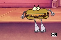 After Robin went off to search for Hawkman, the other Teen Titans got hungry looking for the super hero and found the best cheese steaks in Jump City, Jump City Cheese Steaks. Bumblebee was still troubled by Robin's claim that Hawkman treated them like children. The others didn't think Hawkman was a villain either. Beast Boy equated Hawkman to his vegan cheese steak, he shouldn't even exist but he does and he's perfect. Cyborg mused it would have been cool to have the perfect friend. Raven was pretty sure they weren't going to be friends with Hawkman after that day and conjured a talking vegan cheese steak. Beast Boy bid him happy birthday. It was so excited it leaked cheese out of his mouth. Bumblebee was confused and thought Raven's magic was evil. Raven confirmed that but it evened out because the sandwiches were so good. Cyborg implanted nanobots in it and it generated legs and arms. They all left and saw Hawkman pushing an amnesiac Robin in a stroller across the street. After a misunderstanding, a fight broke out.