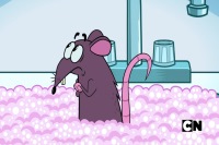 Robin was horrified to find a rat bathing in his bowl in the sink. Beast Boy and Raven revealed he was Howdy, Sticky Joe's pet rat. Robin was further disgusted when Joe brushed Howdy's back and butt with his toothbrush. The Titans had to leave the Titans Tower to fight Brother Blood but Robin instructed Joe to get rid of Howdy. Joe put Howdy back into the sink. Using the bubble suds, Howdy pretended to be Superman, then Wonder Woman, and Batman. They high fived but Joe noticed Howdy has very long nails. He produced nail clippers but Howdy was scared and ran away. The chase wrecked the kitchen. Howdy hid in a cabinet. Joe opened it but all the cans of beans fell on him. Howdy made it to the elevator. Joe found a chute behind a portrait and climbed up a narrow passage to the roof. Howdy backed into the cockpit of the T-Jet but tripped on a button, turning it on. After the canopy closed, Joe clung to the exterior as the jet took off. It soon crashed into Killer Moth's Cocoon.