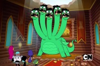 The Hydra-Bin is a five headed monster created by an evil Abraham Lincoln to serve as a living weapon to destroy the United States of America as part of Raven's Crazy Adventure spell. Its faces resembled Robin's, a blank that Beast Boy filled for "something dumb" in Raven's spell. Lincoln hopped on its back and stated he was going to destroy the USA in order to form a more perfect union: the United States of Lincoln. The Titans charged but the Hydra-Bin chewed and spit them out then it flew off and wrecked havoc in Jump City. Starfire thought pottery making would stop Lincoln as she chose it for the useless skill for Raven's spell. They threw their pots but they landed well before hitting the Hydra-Bin and smashed to pieces on the street. The Hydra-Bin knocked them into a building with its tail. Lincoln proclaimed no one could stop him from building his new land.