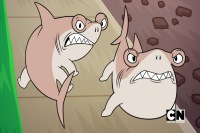 Land Sharks are sharks kept by the Porch Pirates. Able to walk and survive on land, they bear traits similar to dogs like barking, scratching themselves, and chasing their own tail. Rather than be extorted by the pirates, the Teen Titans were forced to walk the plank. Robin didn't believe Land Sharks existed until one chomped the edge of the plank off. They agreed to help the pirates steal a box so they could get their new smoothie machine back. After the Titans stole a box from Axis Chemicals, the Porch Pirates abandoned them on a Stuff Mart parking lot island. They were prevented from leaving by the Land Sharks. Two weeks later, little had changed. A small box blew onto the island but Beast Boy discovered there was nothing in it but a hole in the bottom. One of the sharks bit a piece off and looked happy. The sharks all lined up. He realized they ate cardboard boxes. Robin formed a plan. They each bonded with a shark and rode them. They soon caught up with the Porch Pirates and easily dodged their cannonballs.