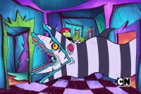 Sandworms are gigantic supernatural worms that prey on other entities like ghosts. Beetlejuice is crippled with fear whenever they are near. While the Teen Titans searched for the door to the Lost Spirits Room, Beast Boy opened a door to a Sandworm. Beetlejuice pulled the Titans to safety just in time but the Sandworm flowed out of its door into the room where Trigon was and swallowed him whole. Beast Boy was concerned but Raven shrugged it off and was sure he would be fine. After Beetlejuice double-crossed the Titans and continued with his plan to take over Halloween, the Titans couldn't say his name three times to banish him. Raven improvised and opened a portal in the sky. A sandworm emerged and descended upon Beetlejuice, crashing through the asphalt. Beetlejuice lit a match and walked around in its stomach until he bumped into Trigon, who he still owed money. Trigon zapped his head and it shrank. He couldn't believe it got shrunk again.