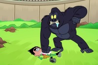 Sticky Joe was about to greet them but they stopped him. He pointed out the carriage was rolling away. Robin grabbed for it and was dragged down a rocky road. The others formed a human chain but they ended up in the roller coaster at Wacka Doodles. Cyborg tried in vain to shush the other people then Raven tried her demonic form but scared them even more. Cyborg tried to use a buzz saw to disconnect the other people. Raven simply removed a bolt. They made it to Jump City Zoo and put the gorilla back with the other gorillas. Robin stayed behind to pat and kiss him goodbye but Beast Boy loudly ate chips. The gorillas awoke and beat up Robin.