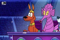 Storm helped judge the Justice League's Next Top Talent Idol Star: Justice League Edition with Jumpa, Krypto, and Bat-Cow. Storm's second cousin is named Light Breeze. By the time Sticky Joe and Sticky Joan got married, Storm was now occupying the rock island in front of the Titans Tower. Aquaman and Storm teamed up for a seahorse race against Aqualad, Black Manta, and Ocean Master. Sticky Joe's right shoe got stuck on Storm's head and in panic, he sped off before the race started. Joe "borrowed" Manta's seahorse and chased after him and Aquaman off-course. Storm raced Aquaman through jellyfish, pufferfish, and lava vents. Aquaman got the shoe off but they got blasted by a lava vent. Starfire later cleaned the rock island of trash to Storm's delight. The living room HDTV then Cyborg's cathode raytube television was tossed by Robin out of the tower. They landed near Storm and exploded. Storm was swallowed whole by Megalodon Jackson but after Jackson was transformed back into a human, Storm was freed unharmed along with the Titans Jackson ate.