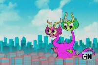 The Twin Destroyers of Azarath are twin demons from Azarath. One is green and speaks English and the other is red and speaks in another language. They appear to be cute and adorable but are really harbingers of doom and purveyors of exquisite mistery and endless pain. They feed on love and affection. Once enough is gathered, they enter a pupa stage and transform while inside a green egg. They emerge as a two headed giant monster. At some point, Raven captured them and they were sealed in a box. While Raven went to gather spell ingredients to banish them back to Azarath, she left the box in the other Titans' care. Starfire couldn't help it despite Raven's warning, and opened the box. To make matters worse, she gave both creatures hugs and snuggles to the creatures. Robin was adamant about them going back in the box but Starfire mistakenly gave them a goodbye kiss. They merged into an egg. Beast Boy tried to hide the evidence and threw the egg into the ocean outside the Titans Tower. The Destroyers emerged and rampaged onto Jump City.