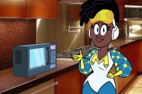 Microwavabelle is the leader of the repair business Hero Hotline, a trio of super-powered repair experts. Starfire and Cyborg hired them to fix an ice machine. Zeep the Living Sponge found a hot dog jammed into the ice machine. Cyborg admitted he experimented with trying to turn it into a popsicle. Microwavabelle noticed their pizza was cold and warmed it up for them. Starfire and Cyborg began breaking things to get them back. Starfire and Cyborg thought they were cool and wanted to hang out with them so the latter broke Robin's juicer. Microwavabelle used the leftover pizza, warmed up, to glue the juicer back together then Zeep absorbed the excess cheese and it looked good as new. Microwavabelle used Zeep was used as a plunger for a clogged toilet and as a hose to put out a fire on the T-Car. Microwavabelle got suspicious about all their calls and they came clean. She told them they could hang out while they fixed the crime alert system.