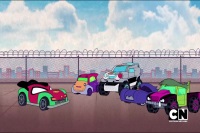 The Turbo Titans were impounded at Car Jail after Dr. Military framed them for the theft of ducks from the Jump City Animal Refuge. Starfire wished they could turn back into normal forms so they could use the human entrance but Raven lamented it was too humid for them to change. Beast Boy had enough and charged the fence but Cyborg warned him too late it was electrified. Robin advised them they could escape if they worked together. Robin ordered them to assemble. They lined up, locked bumpers, and engaged hydraulics. Raven covered them with her cloak. An improvised ramp was made. Robin made it over the fence and escaped. While in mid-air, he fired grapnel lines from his rear and pulled the other Titans out. Their celebration was short lived. The police pursued them. A mysterious semi-trailer truck came to their rescue and they drove inside his cargo hold. The semi ejected oil slicks to neutralize the police. The Titans discovered the semi was Sticky Joe. Robin believed a former associate of Dr. Military was the key to their exoneration, Chip Racerson Jr., the six time championship driver.