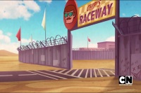 Chip Racerson Jr. opened a raceway park named Chip's Raceway far away from Jump City on desert land. Sticky Joe took the Teen Titans to Chip's Raceway, the last known address of Chip Racerson Jr. and found a trailer in the center. Racerson stepped outside and finished off a can of chips. He asked what they wanted. They revealed they were framed for a crime they didn't commit by Dr. Military. Racerson's grudge was still fresh but he wasn't yet sure he could trust them. If they could beat him in a race, they would earn it. At first, Racerson's car looked like junk but the legends were true and he raced ahead. Robin implored them to work together again. They lined up, locked bumpers, and Cyborg expanded his tank threads over everyone's wheels. Cyborg activated his rocket thruster and they start to gain on Racerson. Robin ordered everyone to combine horsepower. They passed Racerson and crossed the finish line first. Racerson was impressed and agreed to help clear their names. He unknowingly ate chips laced with voice poison by Dr. Military.