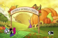Gobble-Gobble Land is a far-away realm that is the source of Thanksgiving magic. A powerful being known as the Great Turkey resides there. Those that seek him must brave the Great Turkey Trot, a 5K that is guarded by beloved Thanksgiving traditions often in giant monstrous forms. The Teen Titans flew there in the T-Jet to get their wishbone repaired so their wishes would expire. After crashing the T-Jet into a giant canned cranberry stack, they started the trot. The first tradition was playing football against giant Brussels sprouts. Cyborg eventually realized the key wasn't getting around them but to go through them. Using his wish of having three more stomachs, he munched through them. Next, they rode a cup down a gravy river. Starfire listened to her Crock Cooker and went left. They went down severe rapids then off a waterfall. Though stuck in a state of sleep, Raven still saved them and floated them down to land safely. They encountered a cornucopia that was really a giant scorpion. It stung Robin in the face multiple times, but his Man Hands fought back then threw it high into the air where it exploded.