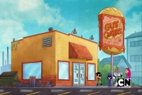 Gut Gushers is a fast food franchise located in San Pedro, California. It has served delicious sandwiches for decades. The signature sandwich is named after the franchise and is packed with cheese. After following Carl Sanpedro's trail to Gut Gushers, he was nowhere to be found. Cyborg was creeped out by the wood paneling and wanted to leave. Robin opted to grab a bite to eat but Beast Boy wanted to eat at a fancy restaurant. Robin claimed Gut Gushers was fancy and pointed out they wrapped their sandwiches in paper. He zipped off to the counter and ordered five gut gushers. Raven didn't think they looked healthy. Starfire inquired about the name. Robin assured her that was just a gimmick. The Titans were skeptical but the cheesy first bite made them chomp down the rest of their sandwiches. Not long after, their stomachs exponentially swelled and they gushed cheese all over. Cyborg noticed foot prints. Robin tasted and verified they were mustard, mustard footprints left by Carl Sanpedro. They took off. An employee readied a mop and sighed.