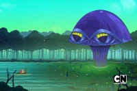Cyborg checked the podium at the meeting area and found controls that moved the Hall up and down. Starfire was curious about the big red button and pressed it. The Hall lifted off. Robin pointed out they could fly the Hall to the gala. He wanted to drive but Cyborg refused. They fought for the controls but crashed into the swamp and got stuck. They learned they rammed Swamp Thing and brought him back to life. Swamp Thing was mad and told them the helmet was for a giant alligator named Boudreaux. They didn't believe him until Boudreaux arrived to get his revenge. The Titans and Swamp Thing ran back into the Hall and took off. Boudreaux gave chase. Cyborg eventually crashed into some rocks and the Hall blew up. They used a hapless Swamp Thing as a substitute to regrow a head of hair for him.