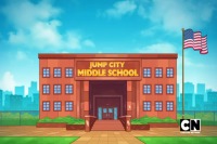 Jump City Middle School is a public middle school in Jump City. When Robin's mind was warped from the Ultimate Pair, he tried to makeover the whole city and make it cool. After Jump City Elementary, he used the shoe's drip magic and turned the middle school into a cool Tyrannosaurus Rex. It high-fived the school bus Robin turned into a monster truck. After Raven scuffed one of the shoes, the pair lost its power and the school returned to normal.
