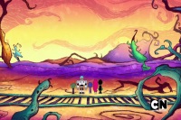 Beast Boy opened a door to a Sandworm. Beetlejuice exclaimed he hated them and pulled the Titans to safety just in time but the Sandworm flowed out of its door into the room where Trigon was and swallowed him whole. Beast Boy was concerned but Raven shrugged it off and was sure he would be fine. Starfire found the door to the Lost Spirits Room but it was locked. Beetlejuice informed them they just had to scare the keys off the janitor. Beast Boy pointed out they weren't good at being scary. Beetlejuice slapped him and ended up explaining that they were dead so they could make their face as scary as they wanted then apologized for hurting him. They morphed their faces to Beetlejuice's satisfaction. Robin was last but he told him his face was gross enough as it was. The janitor only freaked out when he saw Robin and ran away. They opened the door but they didn't see the Halloween Spirit.