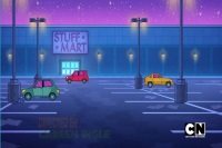 After the Titans stole a box from Axis Chemicals, the Porch Pirates abandoned them on a Stuff Mart parking lot island with a well spaced hidden spring pad. They were prevented from leaving by the Land Sharks. Two weeks later, little had changed. A small box blew onto the island but Beast Boy discovered there was nothing in it but a hole in the bottom. One of the sharks bit a piece off and looked happy. The sharks all lined up. He realized they ate cardboard boxes. Robin formed a plan. They each bonded with a shark and rode them out of the lot in pursuit of the pirates. A year after the Titans sold their Power Up series pilot, the toys sold like crazy at places like Stuff Mart.